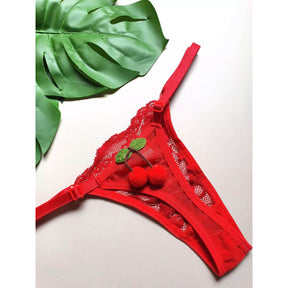 Tanga de regulagem confeccionada em renda na frente e tule atrás, fundo forrado em algodão, cereja em pelúcia pendurada.