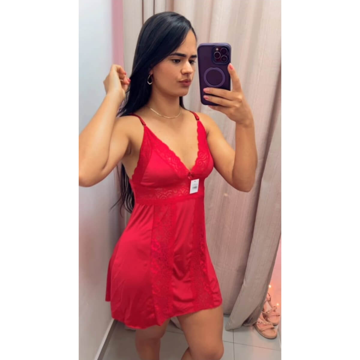 Camisola confeccionada em microfibra de poliéster, modelo acinturado, detalhes em renda, alça de regulagem.
