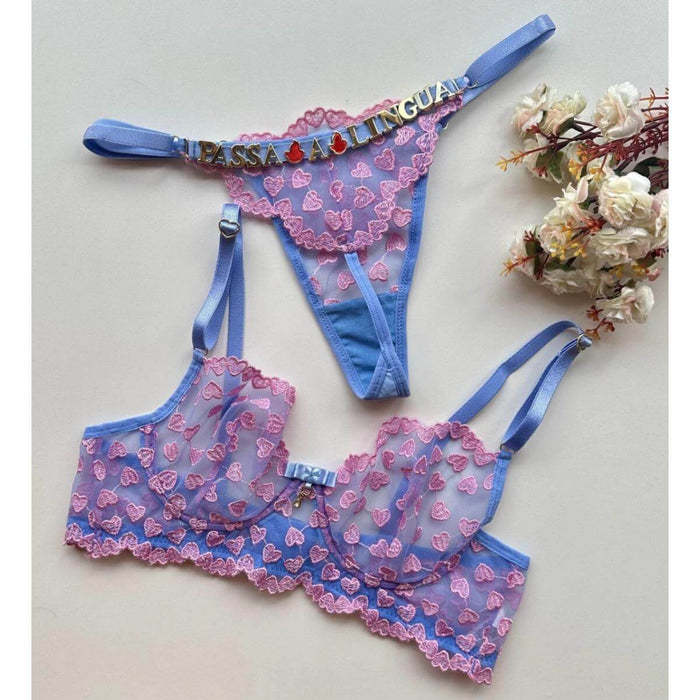 O sutiã possui aro e é sem bojo, feito de tule bordado, com alças ajustáveis em metal no formato de coração.