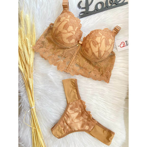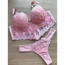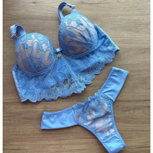 Conjunto de lingerie em tule bordado, com bojo, alças e laterais reforçadas e calcinha fio duplo.