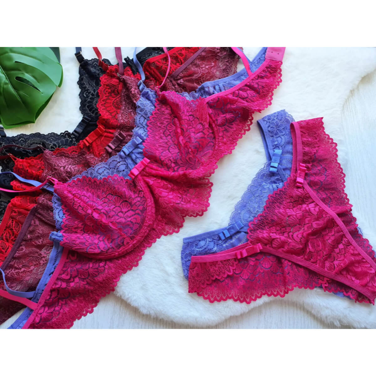 Conjunto confeccionado em renda francesa, sutiã de ar com regulagem em metal, colchete duplo, calcinha modelo semi fio fundo forrado em algodão.