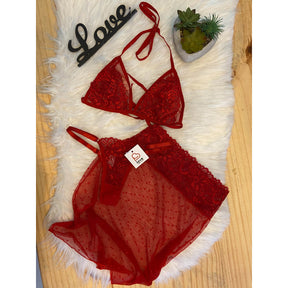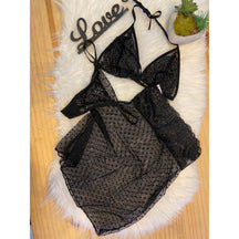 Conjunto confeccionado em tule poá e renda, alças para amarração, tanga fio de regulagem.