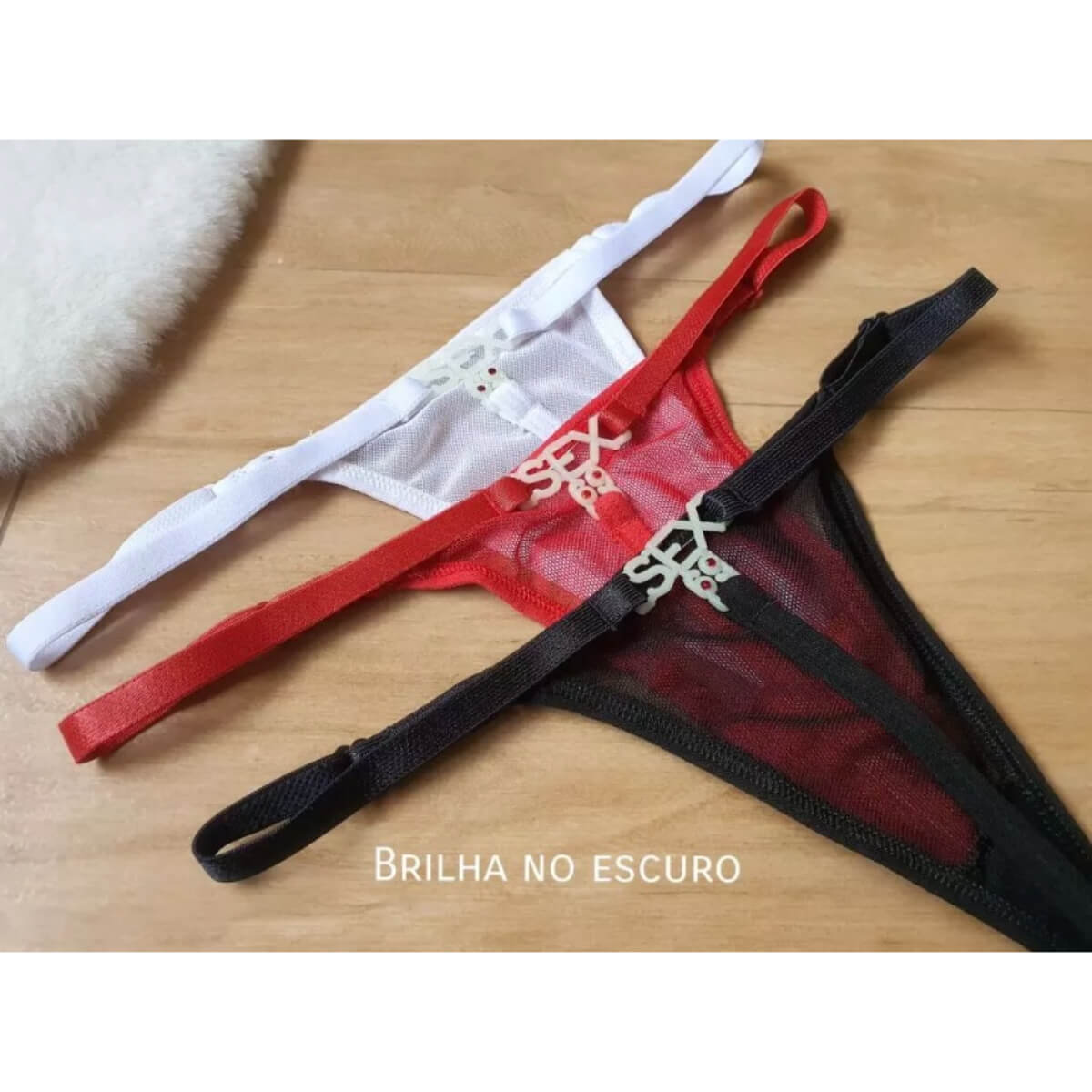 Tanga fio em tule alça de regulagem com pingente Sex 69 que brilha no escuro.
