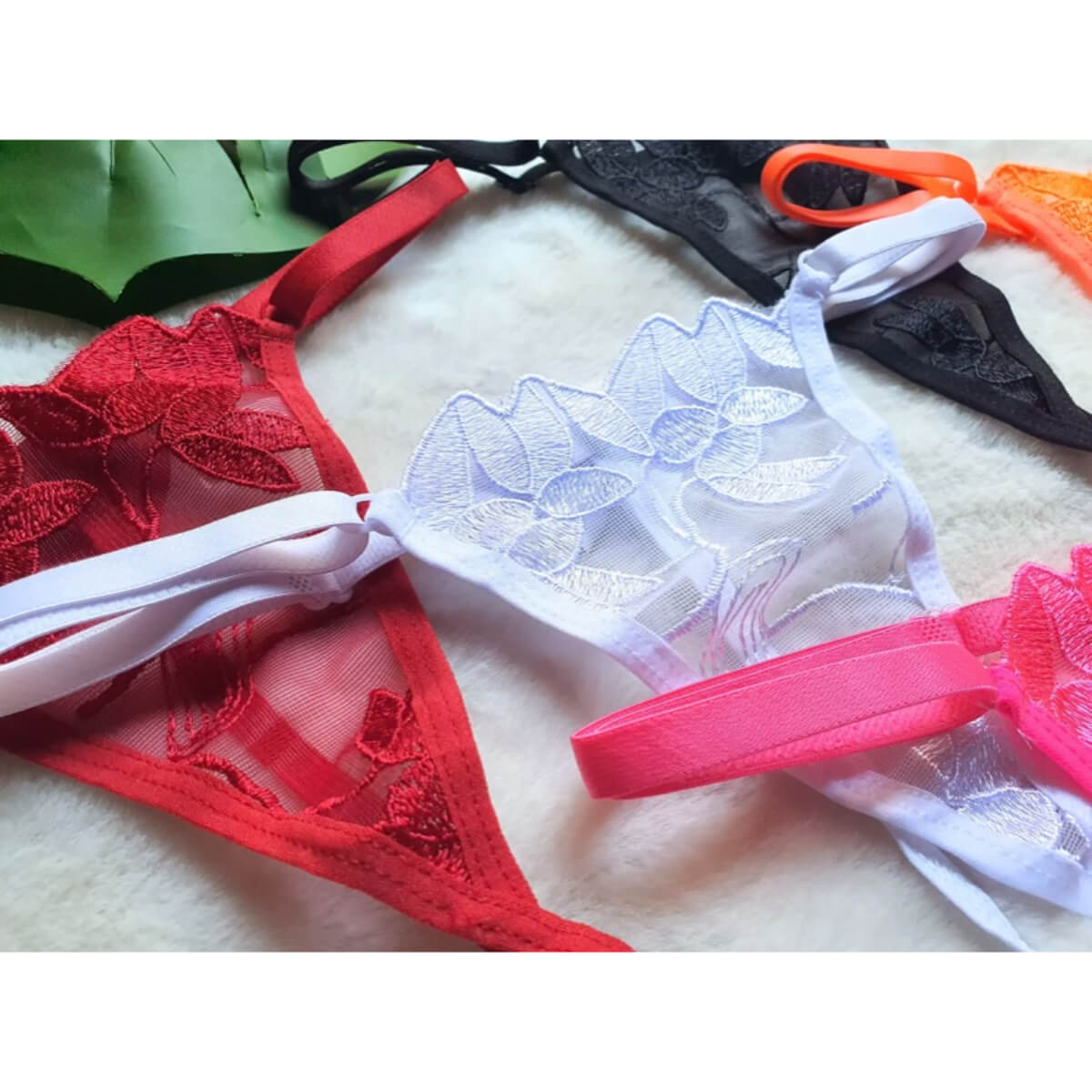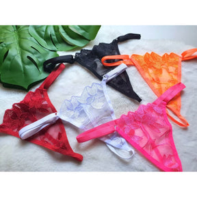 Tanga de regulagem confeccionada em tule bordado, fio atrás com lacinho de cetim.